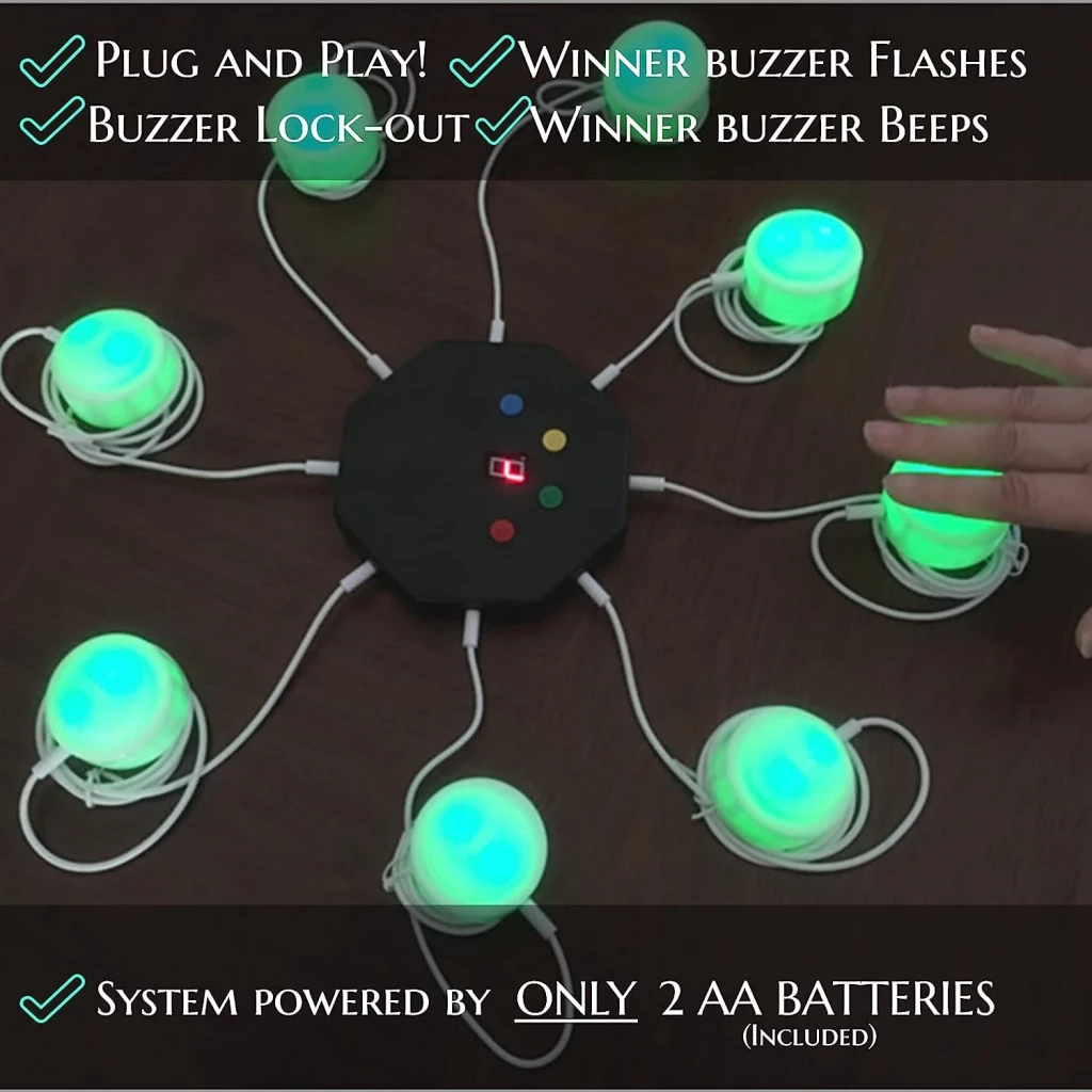 Inkluderar huvudkonsol, 8 LED-knappar, 8 avtagbara 90 cm långa kablar. samt 4st förlängningskablar till knappar.